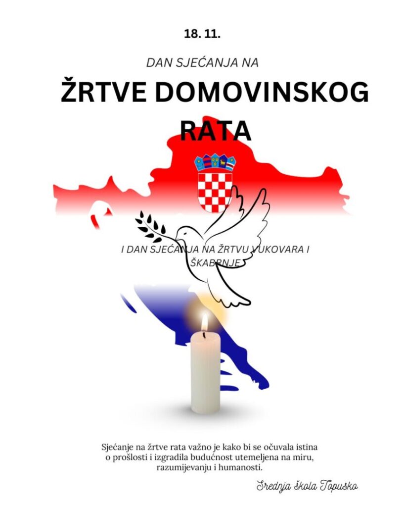 U našoj školi prigodno smo obilježili Dan sjećanja na žrtve Domovinskog rata i Dan sjećanja na Vukovar i Škabrnju. Kroz različite aktivnosti tijekom cijeloga tjedna, učenici su se prisjetili svih stradalih te još jednom istaknuli važnost mira, solidarnosti i zajedništva.