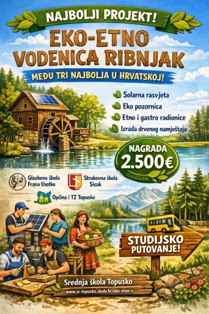 Kroz projekt smo obnovili i oplemenili prostor stare vodenice na jezeru Ribnjak postavljanjem solarne rasvjete, uređenjem eko pozornice, izradom namještaja za etno-kutak, te organizacijom kulturnih i gastro aktivnosti. Učenici različitih smjerova razvijali su svoje praktične vještine, a u aktivnosti su se uključile i lokalne institucije – osnovna škola, vrtić te Općina i Turistička zajednica Topusko.